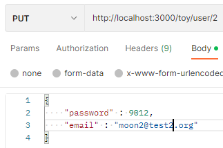 Postman을 통해 Put 요청을 수행하는데, 이 때 요청하는 데이터를 JSON 형식의 MIME 타입을 갖도록 해야합니다.